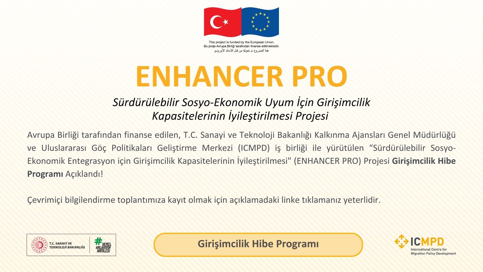 European Union Delegation to Türkiye tarafından finanse edilen, ICMPD Türkiye Temsilciliği ve T.C. Sanayi ve Teknoloji Bakanlığı | Republic Of Türkiye Ministry of Industry and Technology Kalkınma Ajansları Genel Müdürlüğü iş birliği ile yürütülen ENHANCER Projesi uygulamalarının elde ettiği başarılara ilişkin bilgilendirme ve ENHANCER PRO Projesi kapsamındaki Girişimcilik Hibe Programı’nın tanıtım toplantısına kayıt olmak için aşağıdaki linki kullanabilirsiniz.